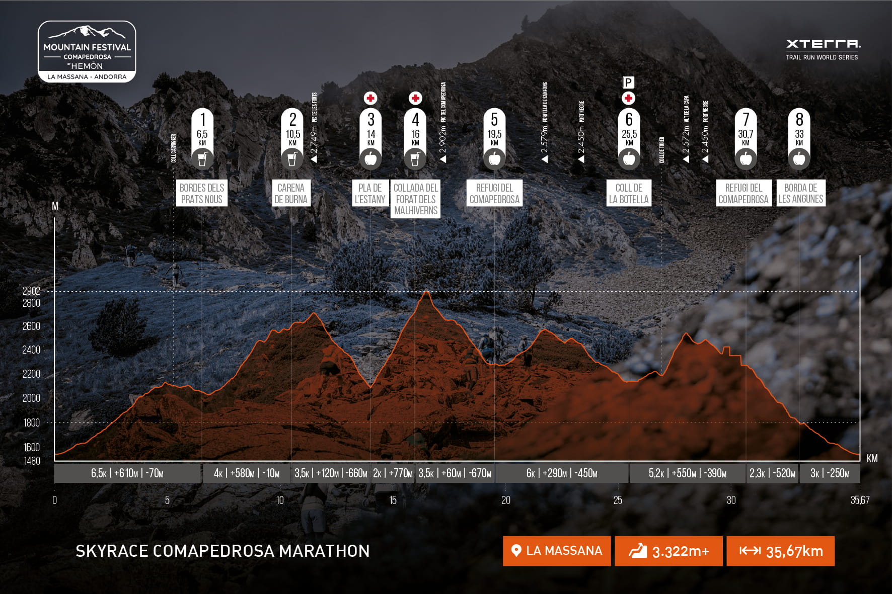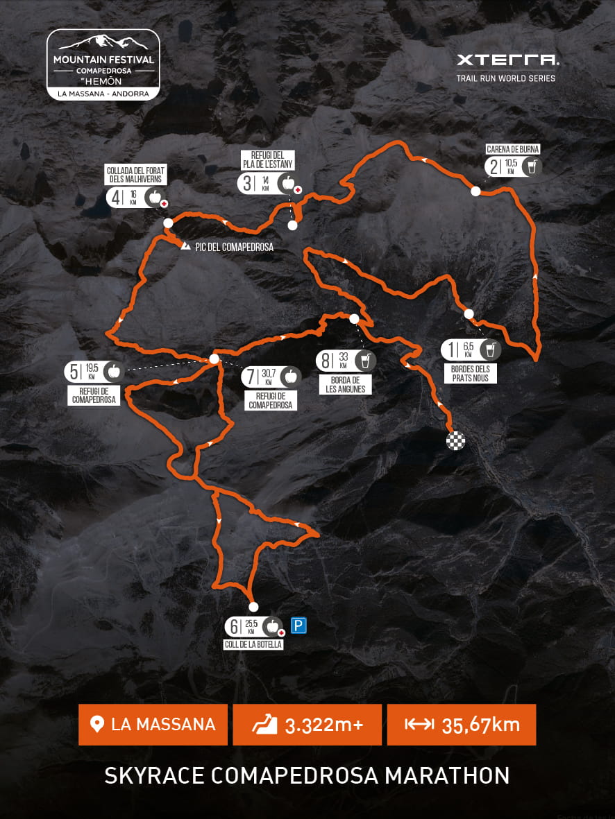 El recorrido comienza desde Arinsal con un primer tramo técnico que rápidamente lleva a los corredores a ganar altura en la montaña. La primera parte transcurre por un bosque denso, pero al ganar altitud el terreno se abre, alcanzando la cresta que te lleva al Pic de les Fonts (2.748 m). Desde aquí, inicia una trepidante subida hacia el Comapedrosa (2.942 m), el punto más alto de Andorra.